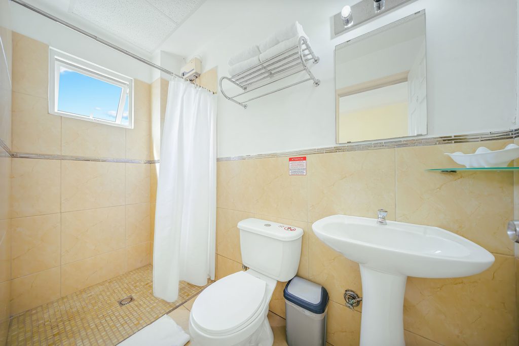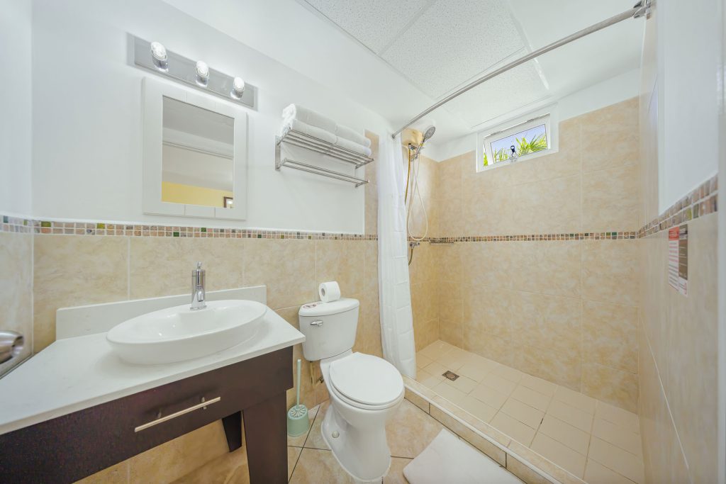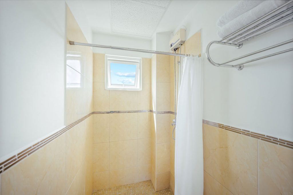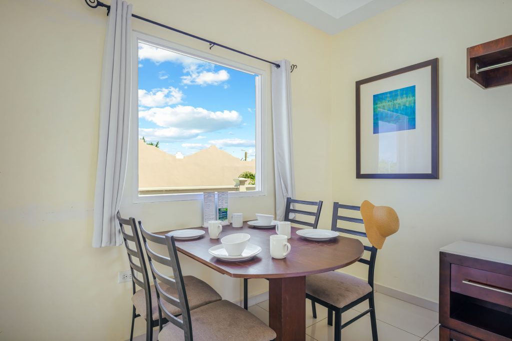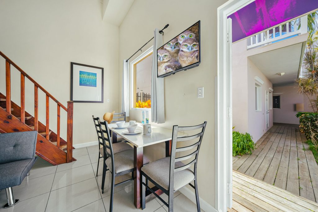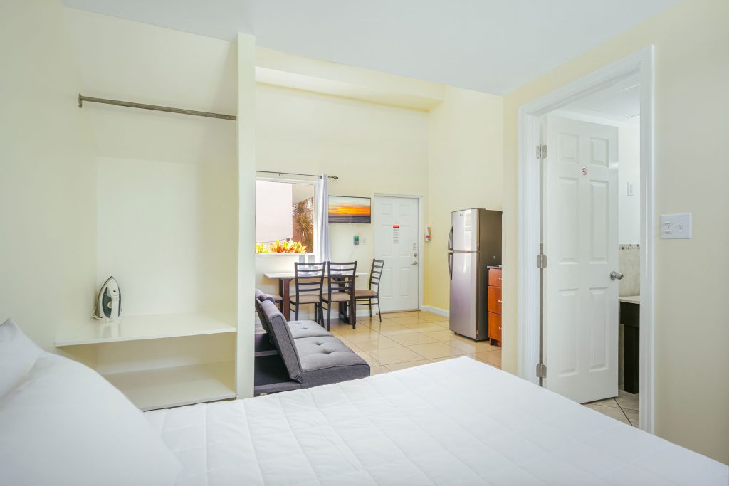 This Double Studio has an open bedroom with a full bed, small dining/sitting area with TV, fully equipped kitchen with a stove, microwave oven, refrigerator, coffee maker and kitchenware and bathroom with shower. The mezzanine bedroom has a second full bed and a futon.